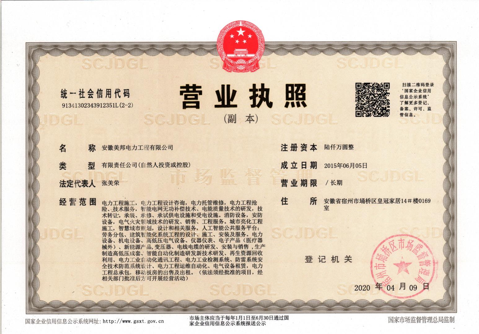安徽美邦電力工程有限公司成立于2015年6月,坐落于宿州高新區。是一家從事電力工程設計、電力設備生產、電力工程施工、電力托管服務、電力工程搶險為一體的一站式綜合性公司。公司現有各類專業技術職稱的管理人員及大批從事電力工程專業施…